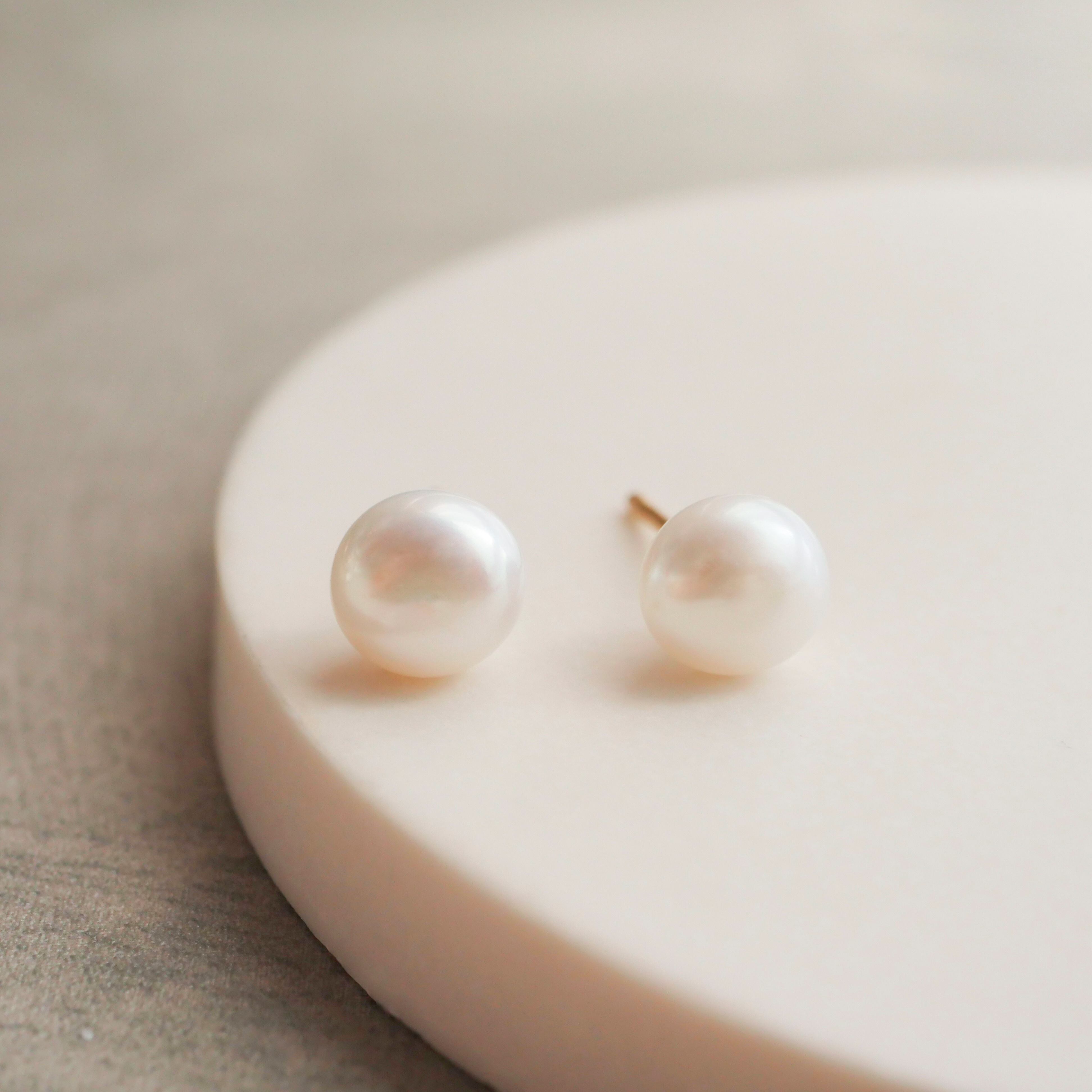 約8mmのホワイト淡水パール(ボタン型)を使用したピアスです。
