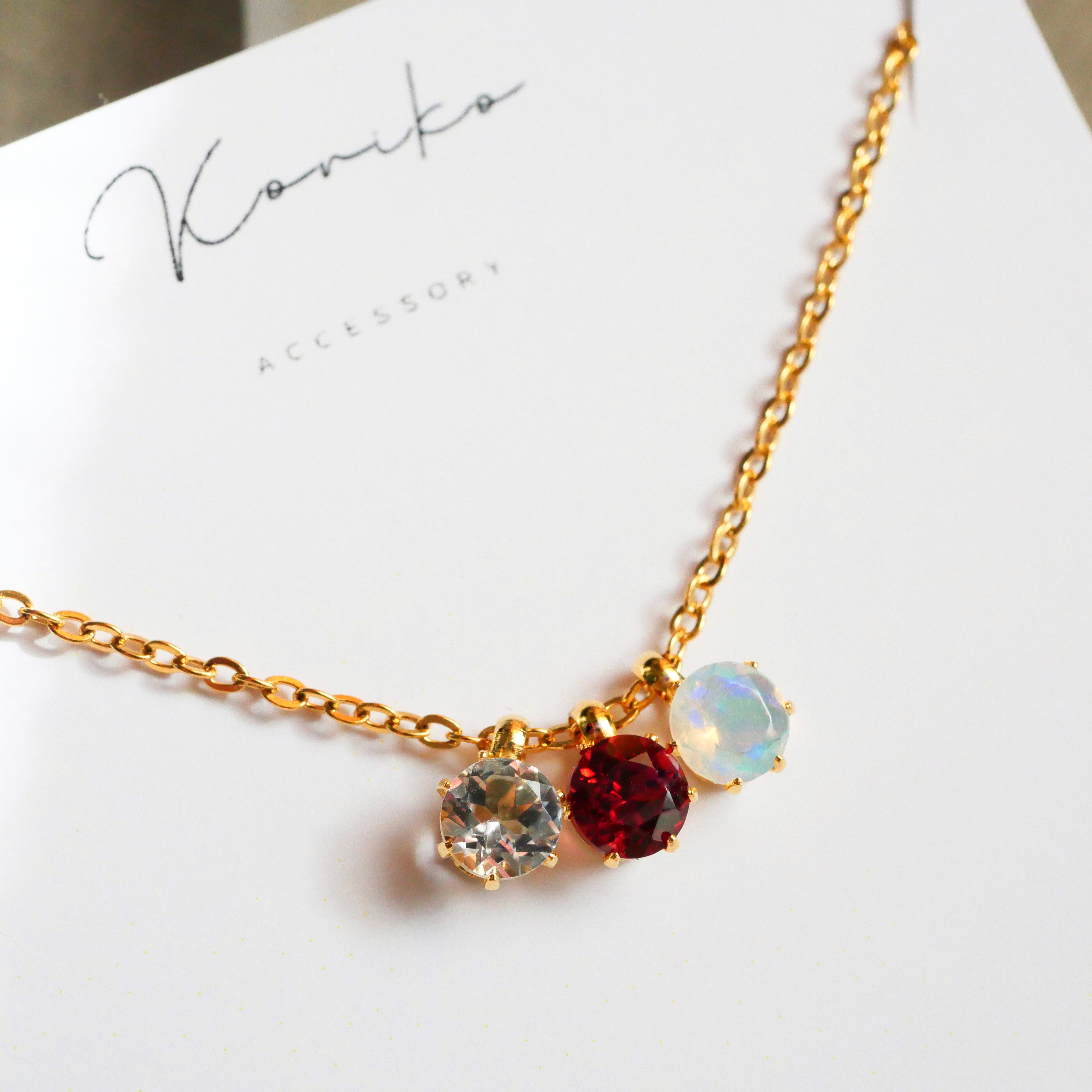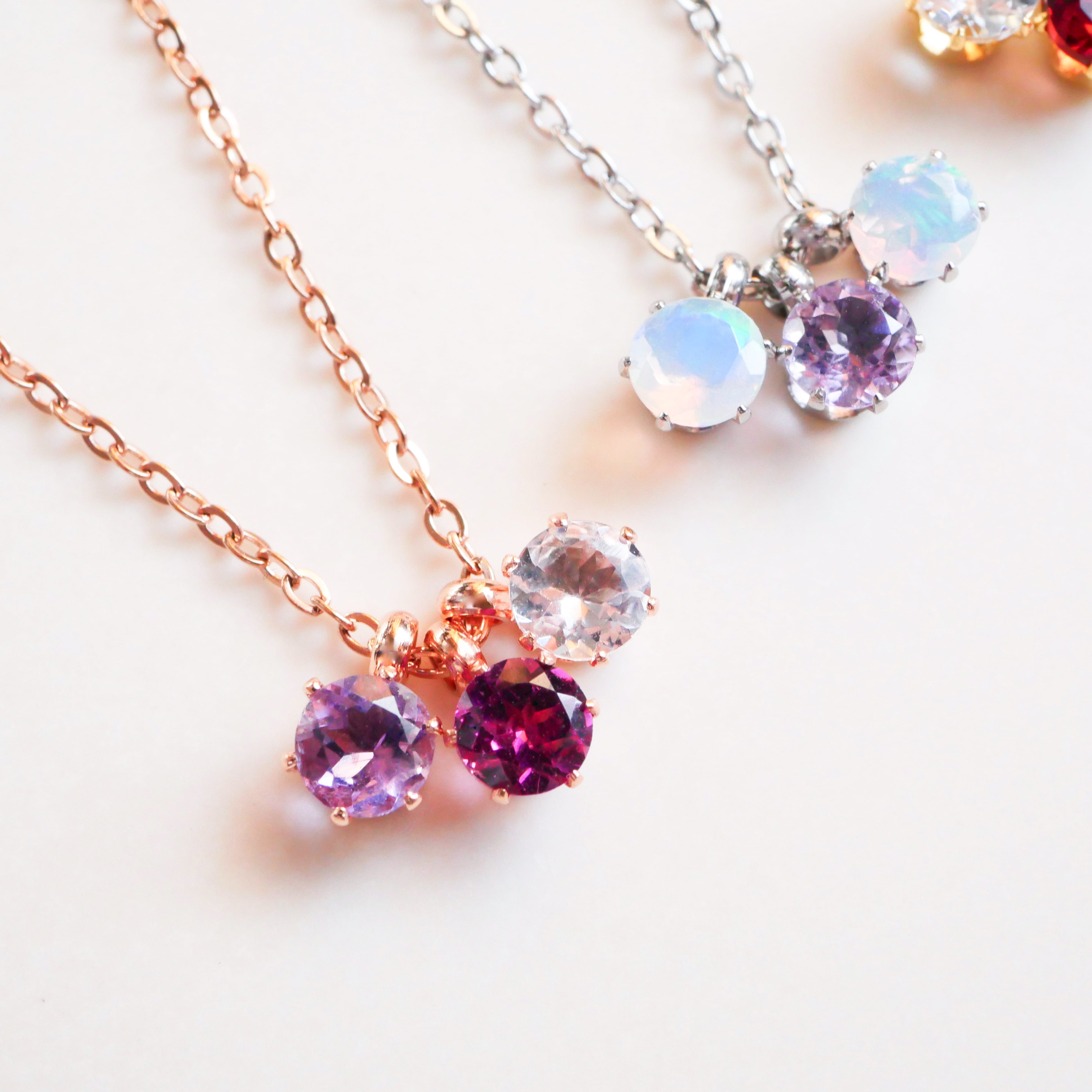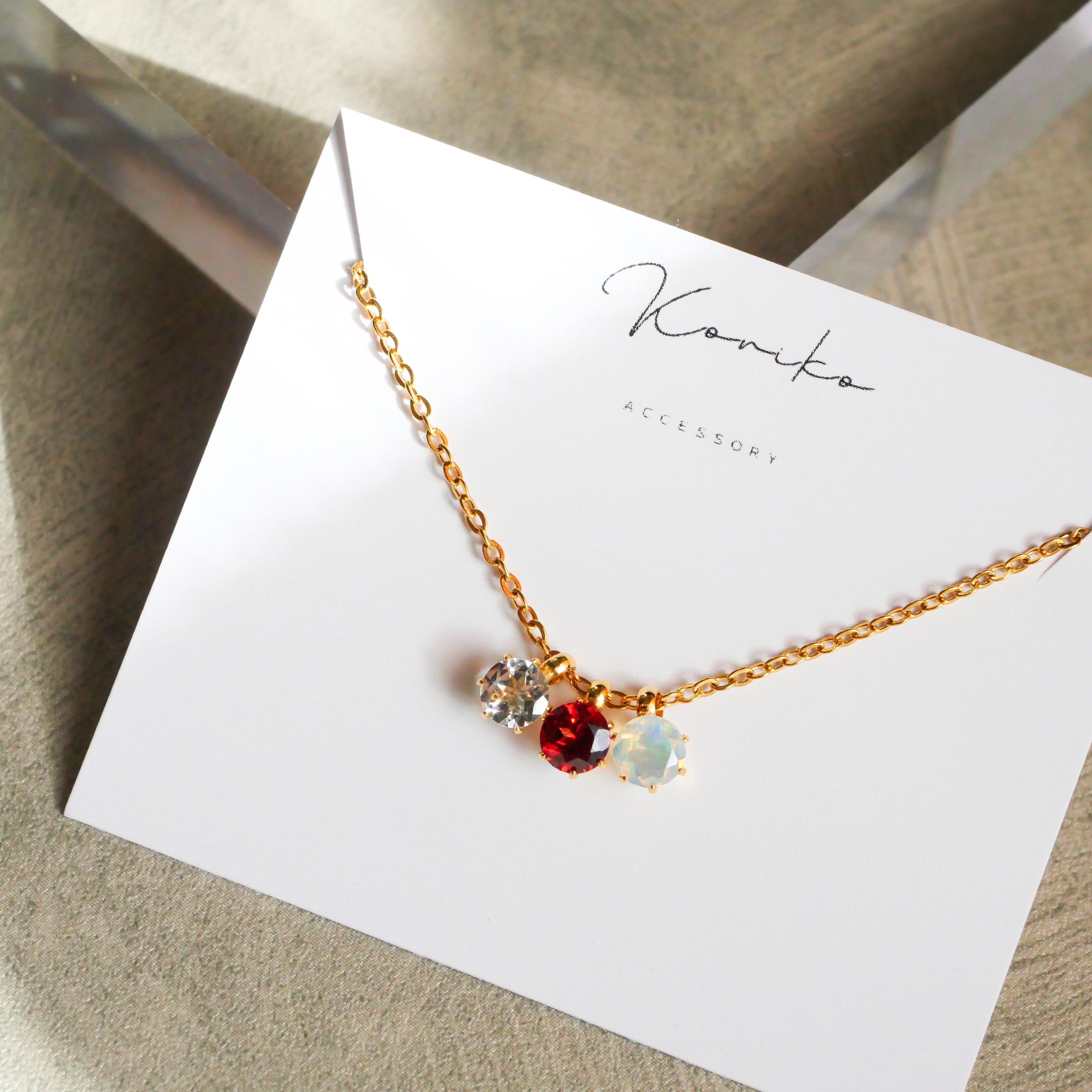 きらりと並ぶ3粒の誕生石が、光の角度でふわっと輝くネックレス。