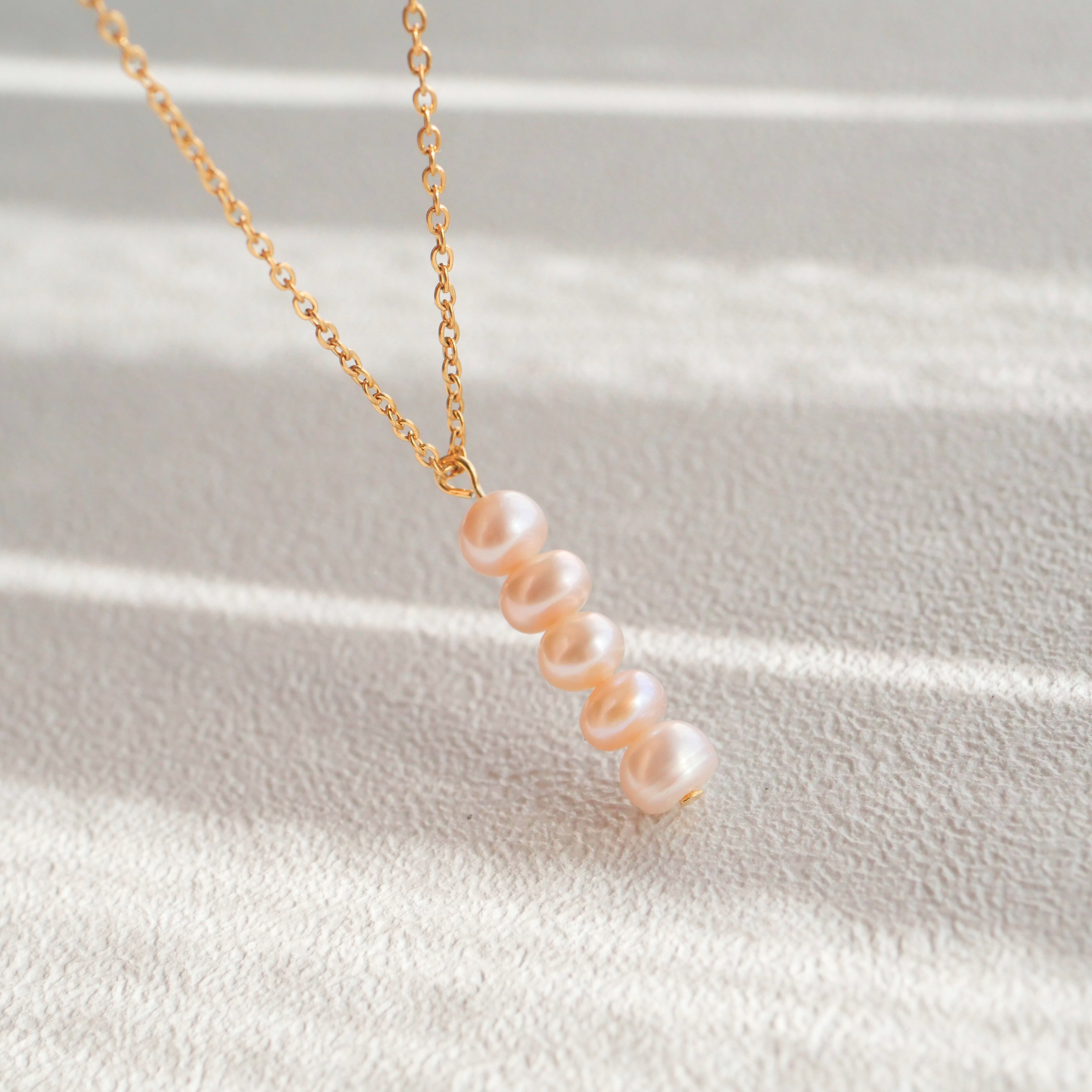淡いピンクの淡水パール5粒 縦ラインネックレス サージカルステンレス 金属アレルギー対応 小ぶり ゴールド シルバー ピンクゴールド フォーマル パールネックレス