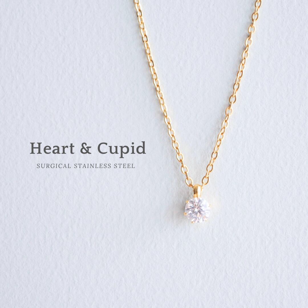 【Heart&Cupid】CZダイヤ 4mm つけっぱなしOK!ハート&キュービッド一粒ゴールド/シルバーネックレス サージカルステンレス 金属アレルギー対応