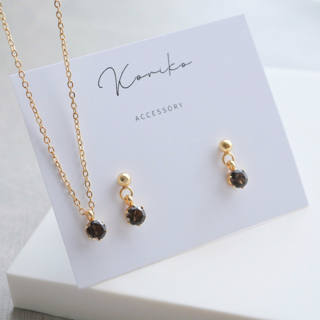つけっぱなしOK!スモーキークォーツの一粒揺れるピアスとネックレスの2点セット サージカルステンレス