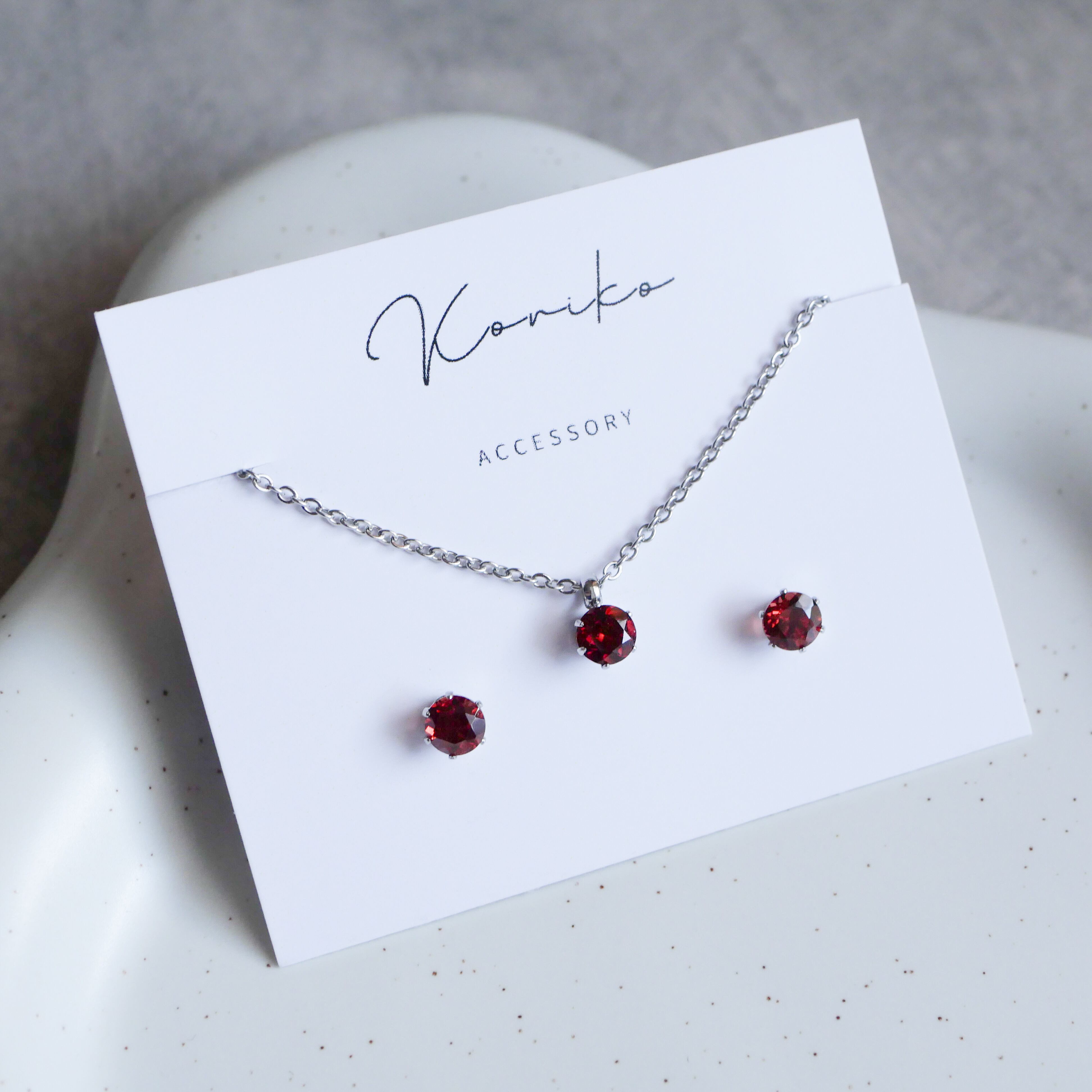 〈赤のきらめき〉ガーネットの一粒ピアスとネックレスの2点セット 1月誕生石 サージカルステンレス 金属アレルギー対応 小さい 小粒 ゴールド シルバー 天然石