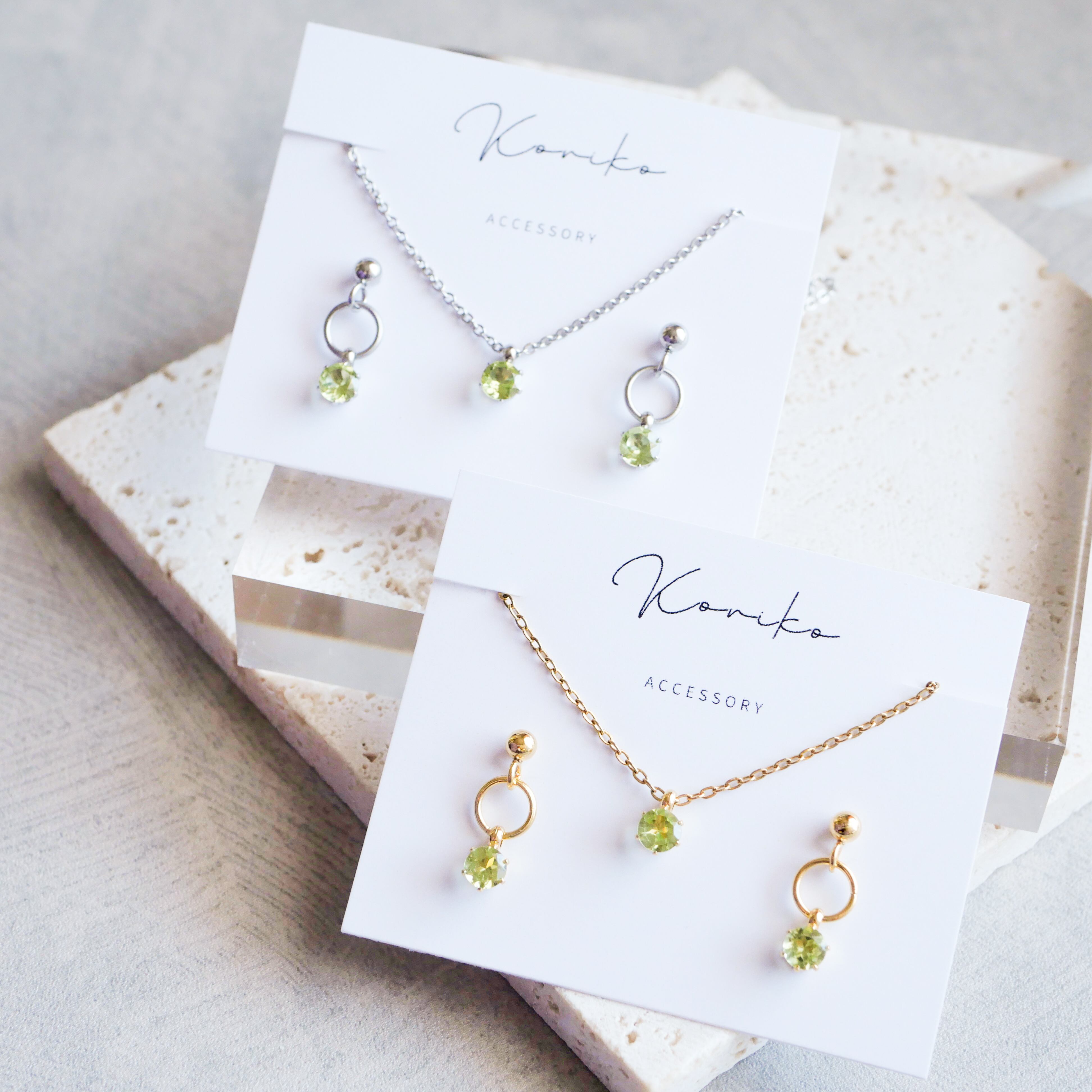 ペリドットの一粒揺れるピアスとネックレスの2点セット 8月誕生石 サージカルステンレス 金属アレルギー対応 小さい 小粒 ゴールド シルバー