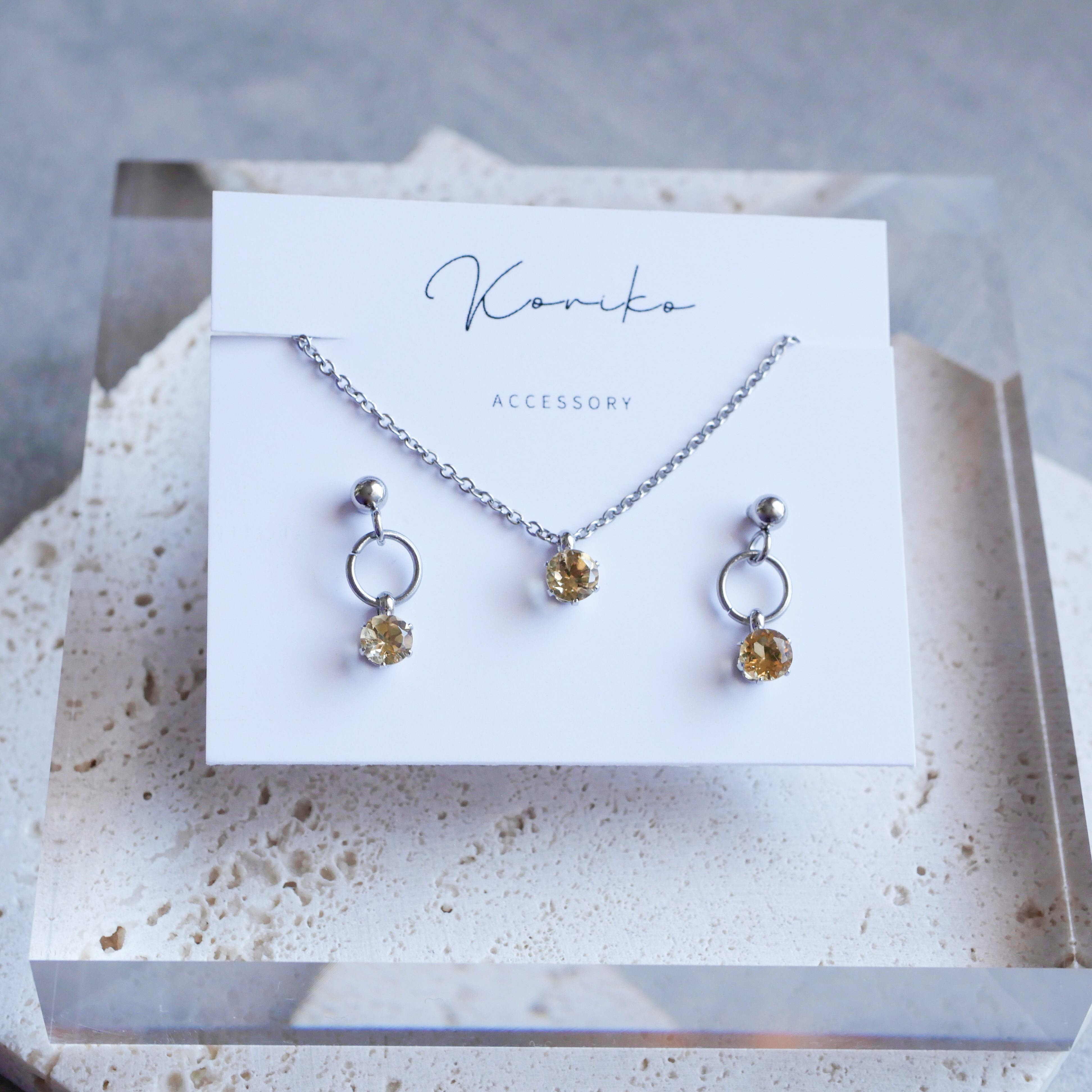 透明感のあるシトリンの一粒揺れるピアスとネックレスの2点セット 11月誕生石 サージカルステンレス 金属アレルギー対応 小さい 小粒 ゴールド シルバー 天然石